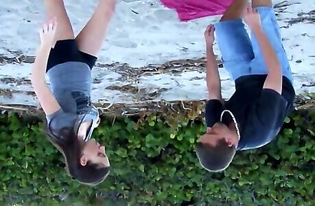 Spunky romping on the beach with crazy black-haired gf