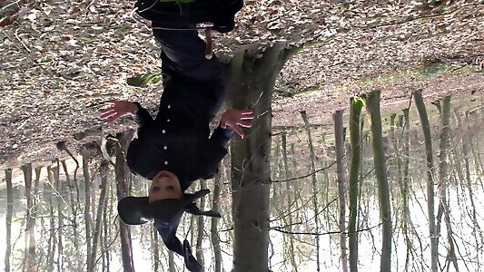 Brunette milf in a costume of a witch just been caught and fucked in the ass from a forest keeper